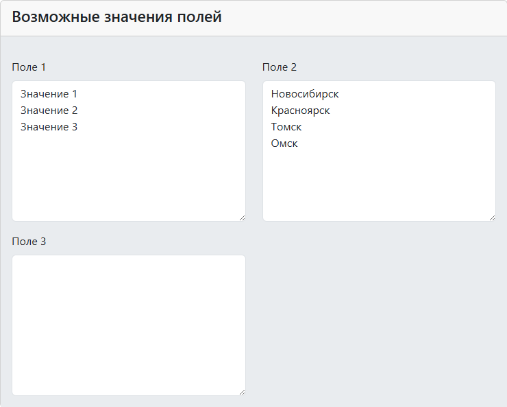 Если настроить эти поля как на рисунке выше, то в качестве значения Поле 1 может быть одно из этих значений: