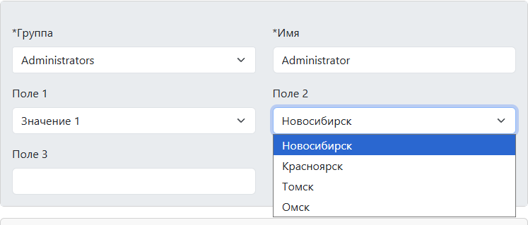 Вот как это выглядит при редактировании. Обратите внимание - Поле 1 и Поле 2 это выпадающие списки, а Поле 3 простая строка редактирования.