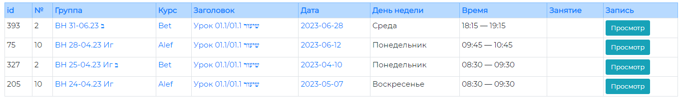Нажатие на название того или иного столбца, находящееся в заголовке таблицы, позволит отсортировать строки таблицы по этому параметру (например, по номеру занятия, по курсам, по названиям уроков, по дате и т. п.).