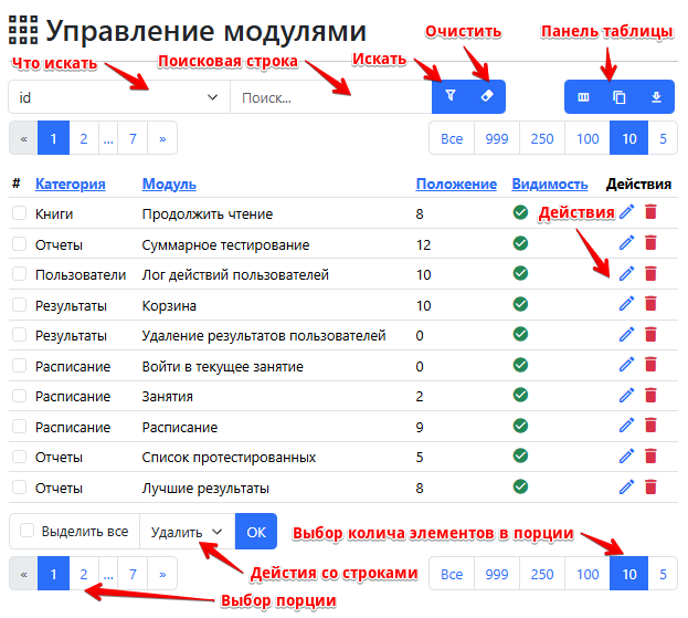 Можно выбрать количество элементов, показываемое на одной странице, Для этого щелкните по одно из кнопок выбора порций, Можно выбрать показ по 5, 10, 10, 100, 250, 999 элементов или показать все элементы сразу. В зависимости от выбранного количества элементов на одной странице будет сформировано разно количество страниц, переключаться между которыми можно с помощью кнопок выбора страниц.