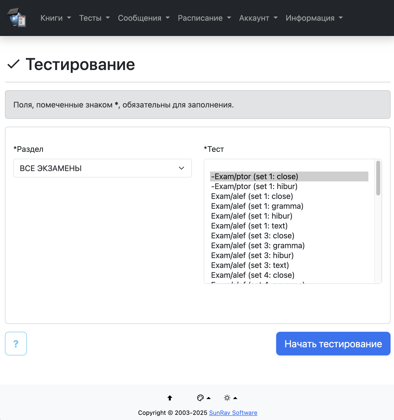 Чтобы приступить к тестированию, нужно выбрать пункт меню Тесты/Тестирование. Появится страница, на которой можно выбрать раздел тестов и затем сам тест. Для начала тестирования нажмите кнопку Начать тестирование.