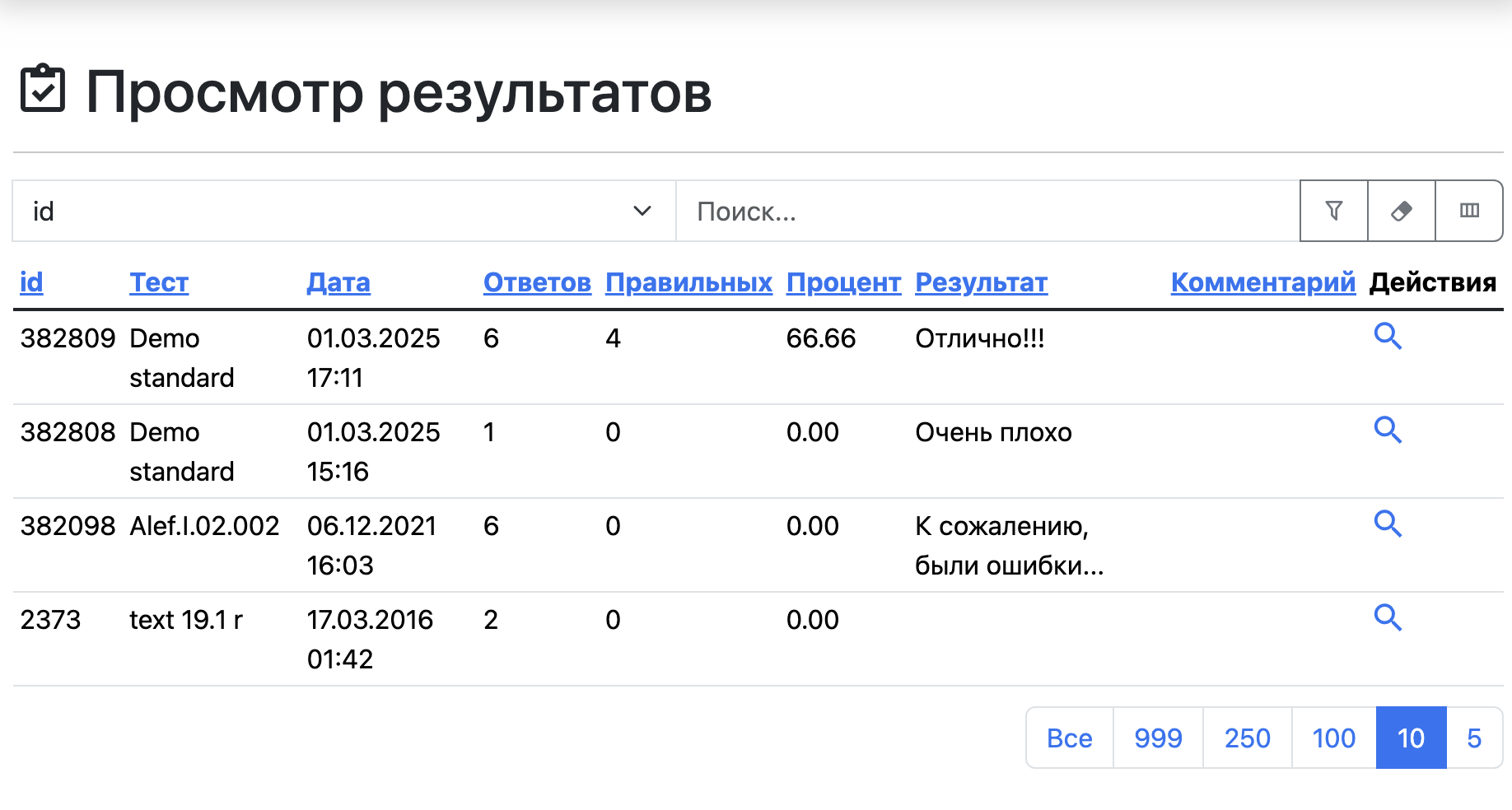Для просмотра результатов тестирования нужно выбрать пункт меню Тесты/Просмотр результатов. Появится таблица результатов тестирования. Щелкните по иконке в последнем столбце чтобы посмотреть подробный результат.