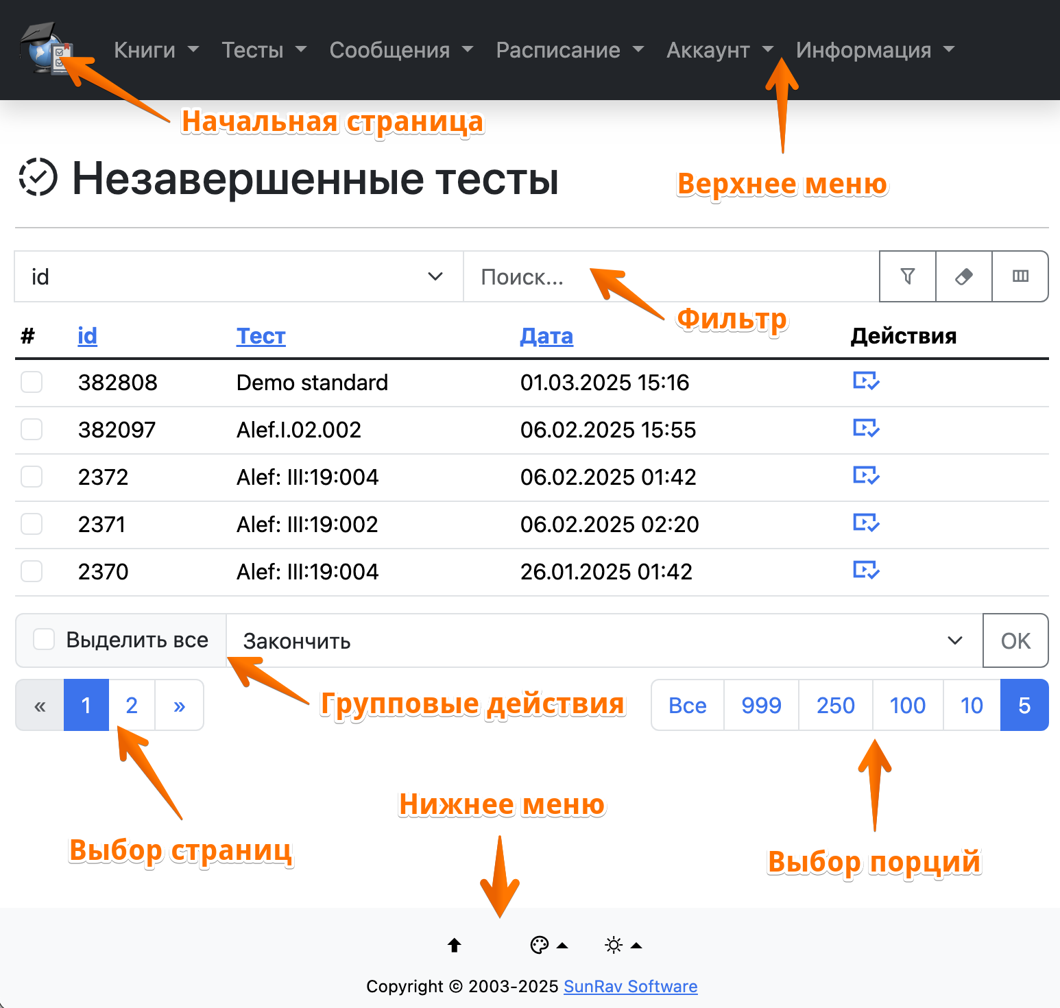 Нижнее меню используется для перехода к началу страницы − кнопка , для выбора визуальной темы интерфейса − кнопка